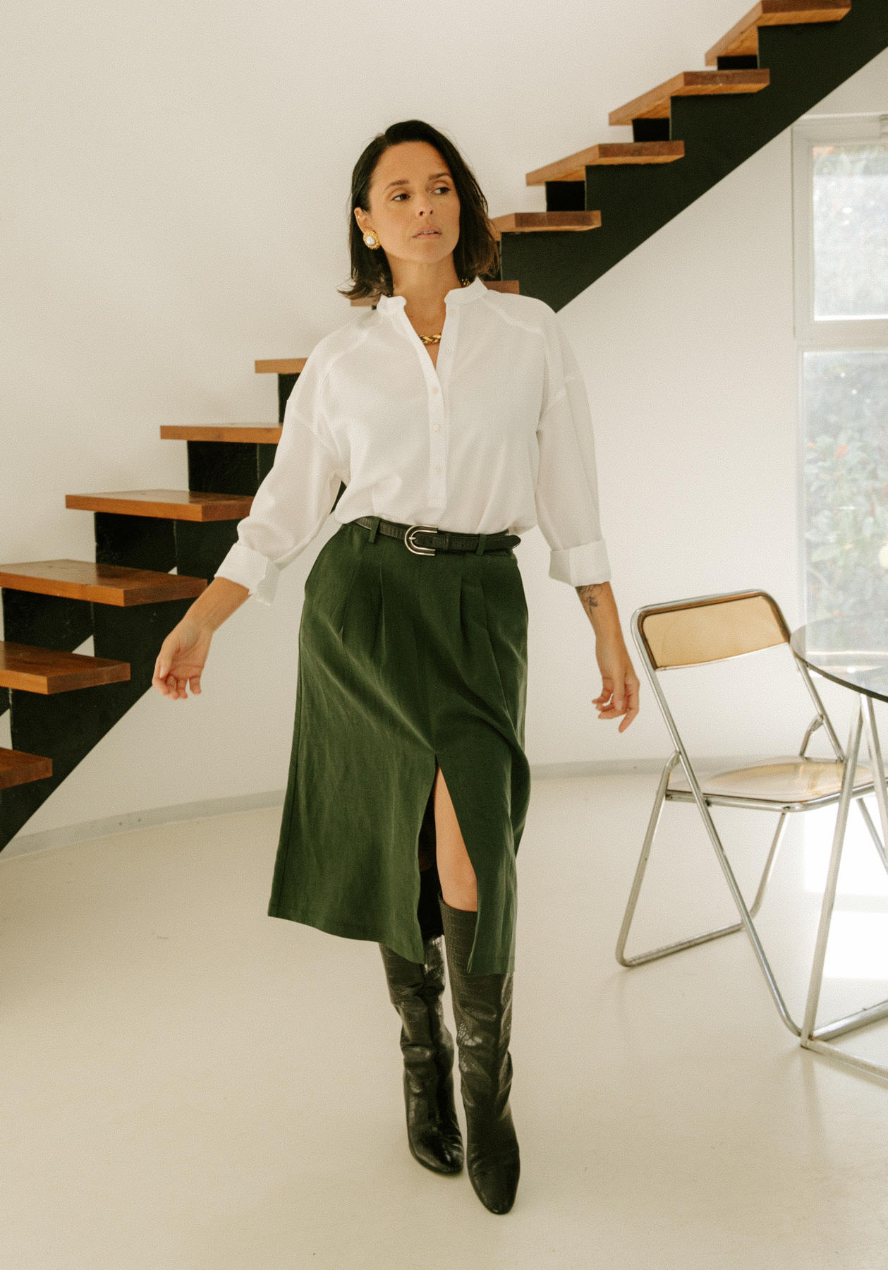 The Silvana skirt is a modern take on classic tailoring, blending masculine-inspired structure with a bold, feminine silhouette.