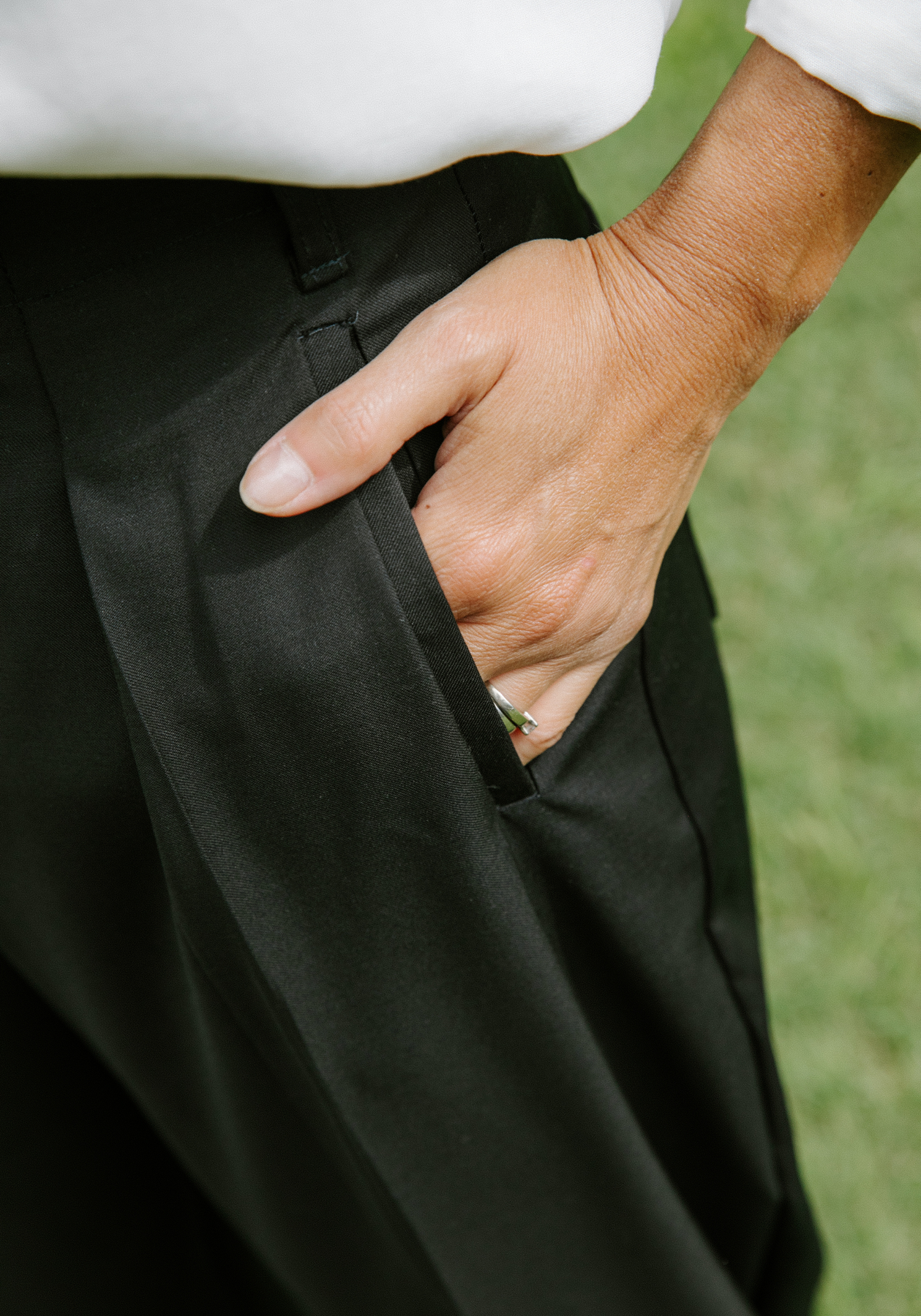 Il reprend les codes du vestiaire masculin avec ses poches passepoilées sur le devant et un pli marqué le long de la jambe, tandis que le dos révèle deux poches plaquées ornées d’un détail signature en profil d’hirondelle. La taille se pose dans le creux de la taille.